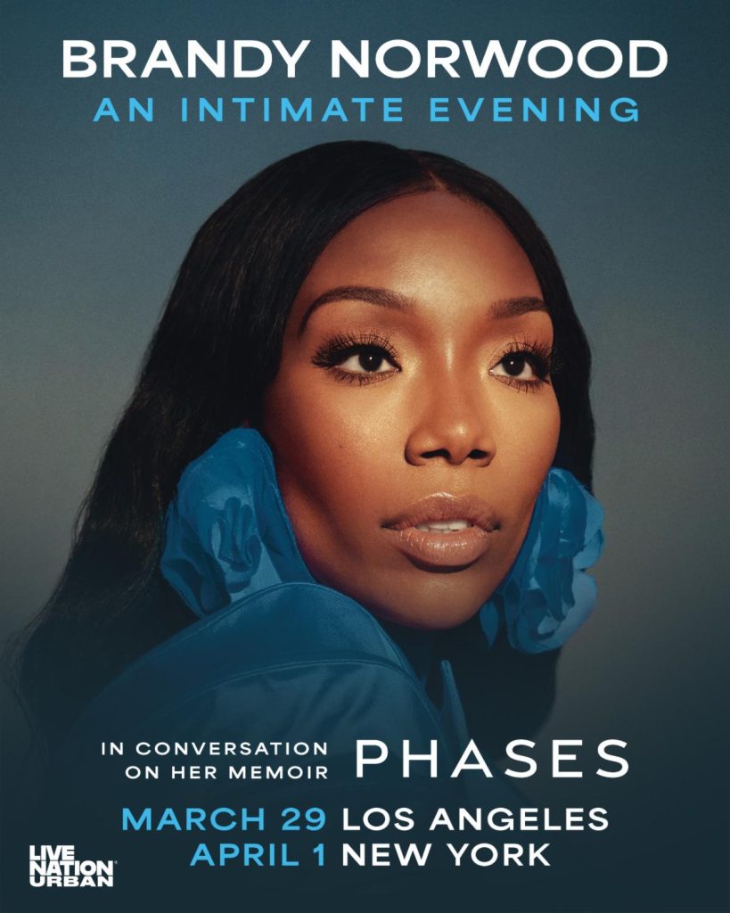 (Los Angeles, CA) — Live Nation Urban (LNU) and multi-platinum, Grammy-winning singer, producer, actress, and global icon, Brandy Norwood, announce “A Conversation With Brandy: Phases Book Tour.” The tour will see Brandy take the stage for intimate conversations in Los Angeles and Brooklyn, celebrating her debut memoir, Phases (out March 31) and the extraordinary journey behind her legendary career.