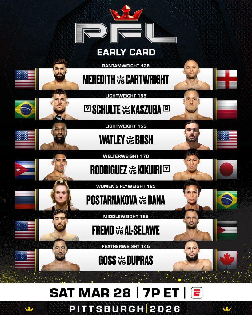 NEW YORK (Feb 18, 2026) – The Professional Fighters League (PFL) today announced the full card for PFL Pittsburgh, set for Saturday, March 28 at UPMC Events Center in Pittsburgh, Pennsylvania.