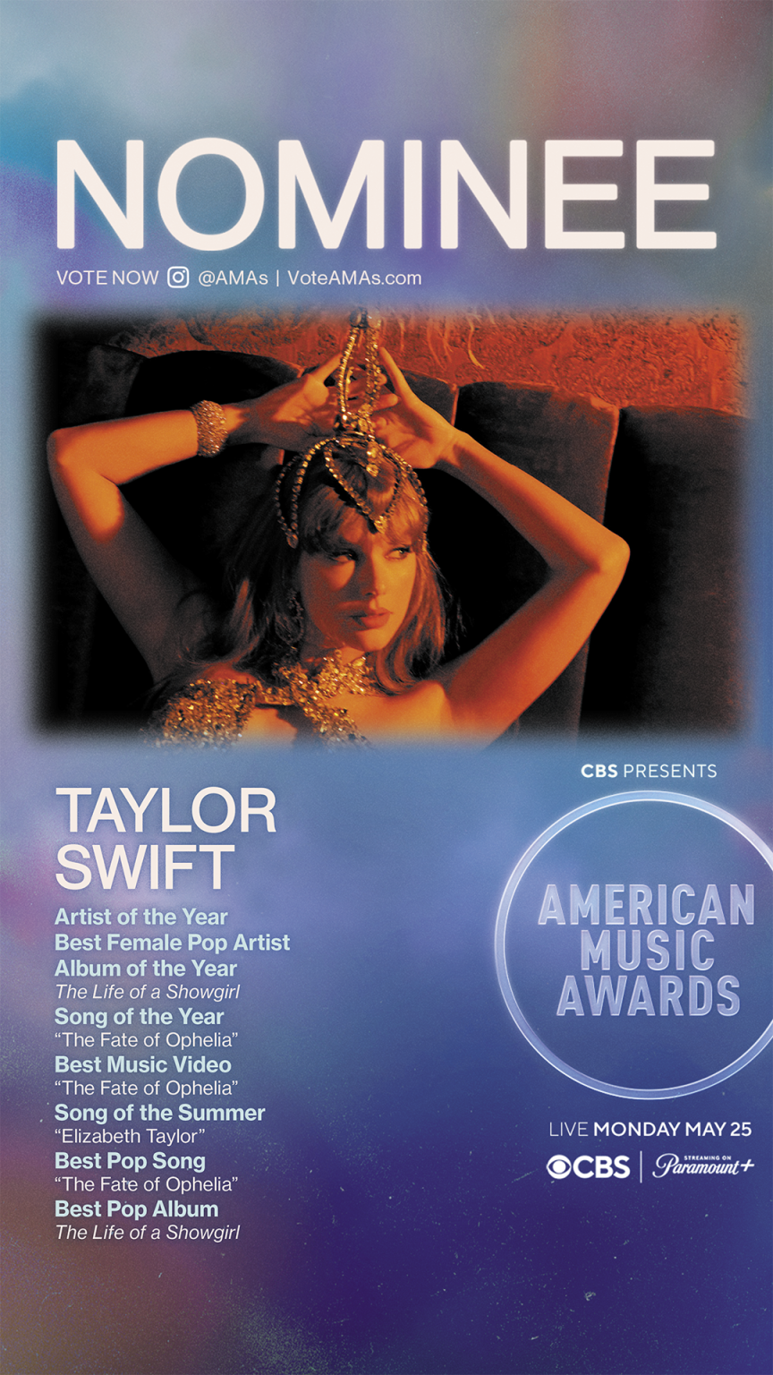- Taylor Swift, the winningest artist in AMAs history, could add to her record-shattering 40 wins, having been nominated in eight categories including Artist of the Year, Album of the Year (“The Life of a Showgirl”), Song of the Year (“The Fate of Ophelia”), Best Music Video (“The Fate of Ophelia”), Song of the Summer (“Elizabeth Taylor”), Best Female Pop Artist, Best Pop Song (“The Fate of Ophelia”), and Best Pop Album (“The Life of a Showgirl”).